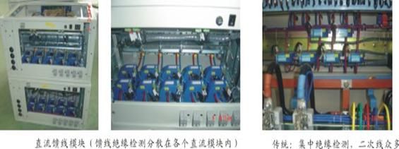 (B)集中功能分散化:直流絕緣檢測分成“母線絕緣檢測”+“饋線絕緣檢測”,“母線絕緣檢測”只需將母線電壓作為裝置電源接入即可,“饋線絕緣檢測”分散到饋線模塊監(jiān)測漏電流,并通過通信上傳數(shù)據(jù)到一體化模塊,進(jìn)行綜合分析;蓄電池巡檢分布化:每層蓄電池配置一臺采集模塊,各采集模塊通過通信總線上傳數(shù)據(jù)分析。